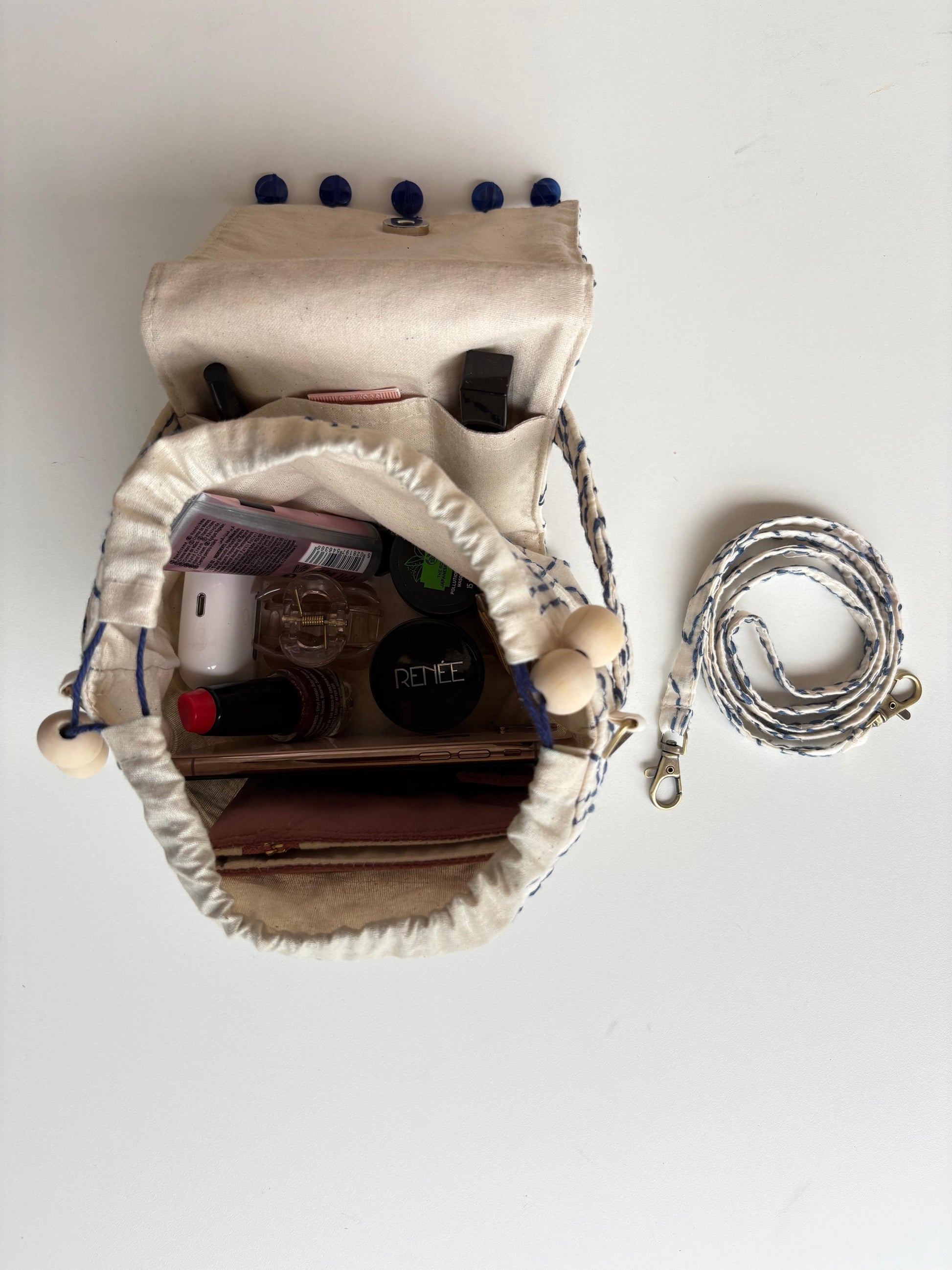 Designed for both style and convenience, it comes with a detachable sling and matching navy beads on the flap — adding a subtle touch of sophistication to your look. Though compact in appearance, it easily fits your makeup essentials along with your mobile phone, cash, and keys.